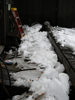 At 1:00am Monday morning several people in the house thought they heard someone falling down the stairs and being hurt because it was very loud. What they heard was huge ice blocks sliding down from the roof of the house onto the back porch and causing it to collapse and break the porch down also.